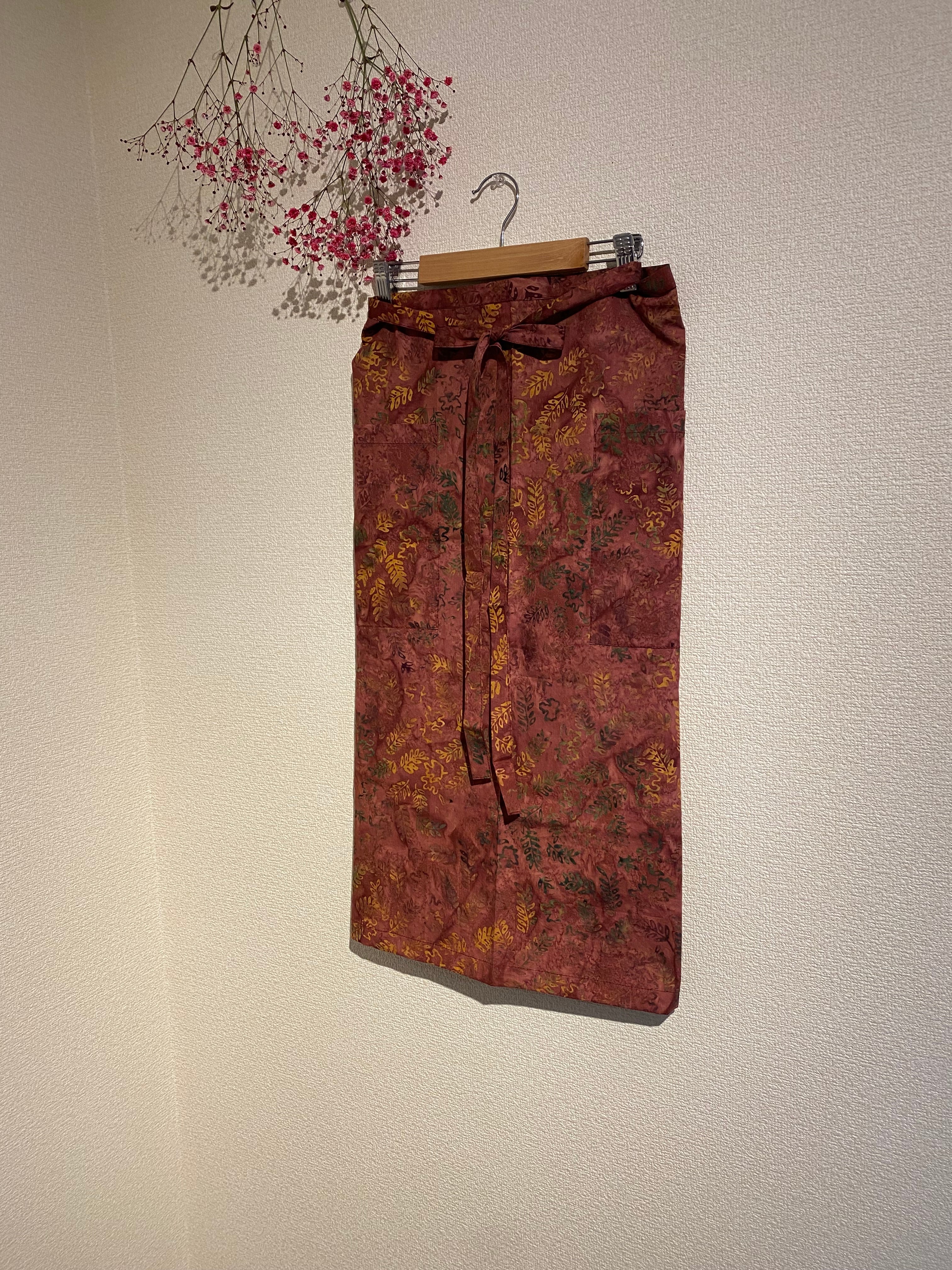 インドネシアのバリ島で製作されたチャップバティック(型押しろうけつ染め)の生地を使用した、オリジナルのサロンエプロンです。シンプルなデザインながら、ロングタイプでポケットが2つ付いており、実用性も兼ね備えています!