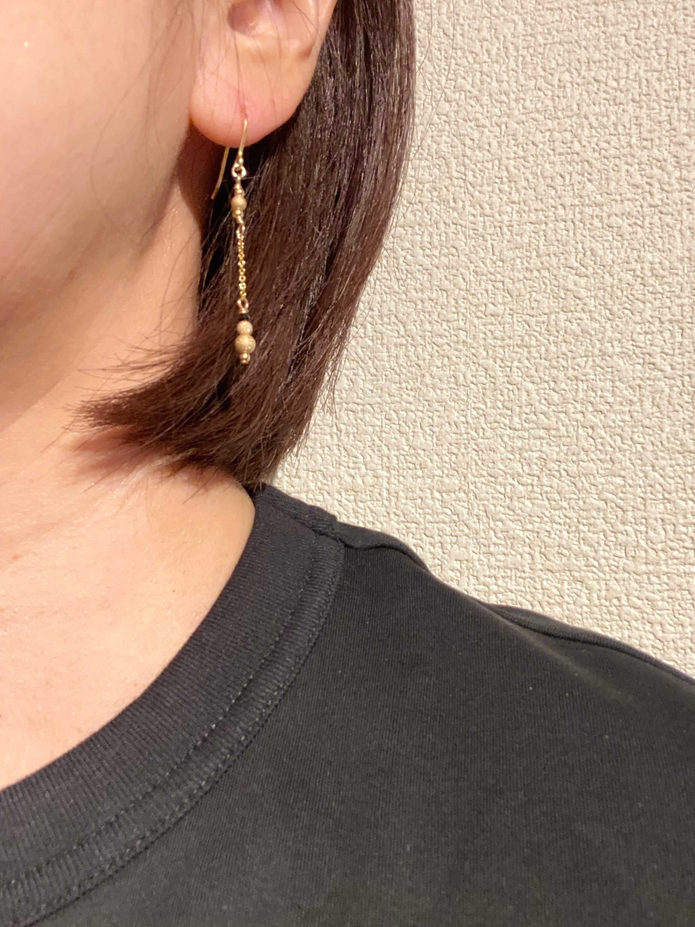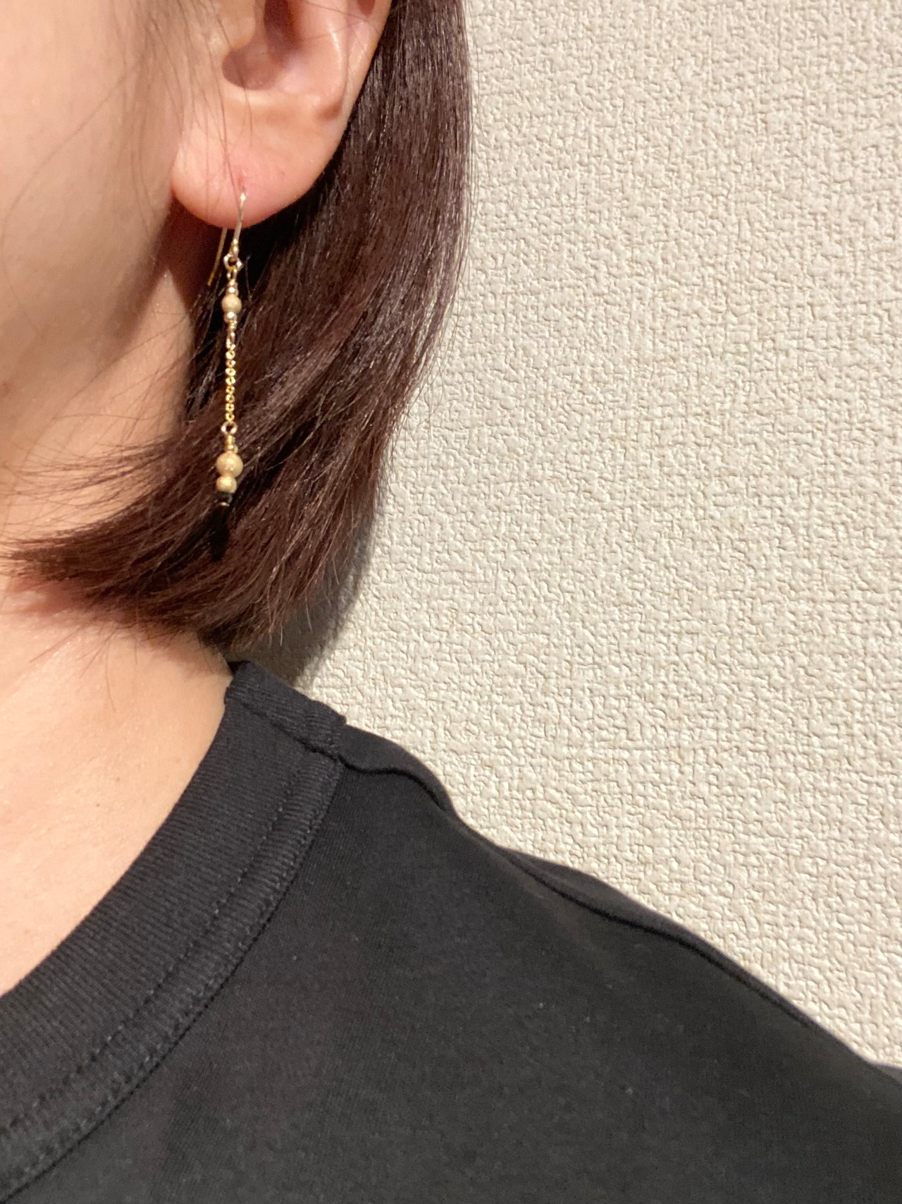 サイズが違うグリッターボールと天然石ブラックスピネルがアクセントになったチェーンピアスです。
