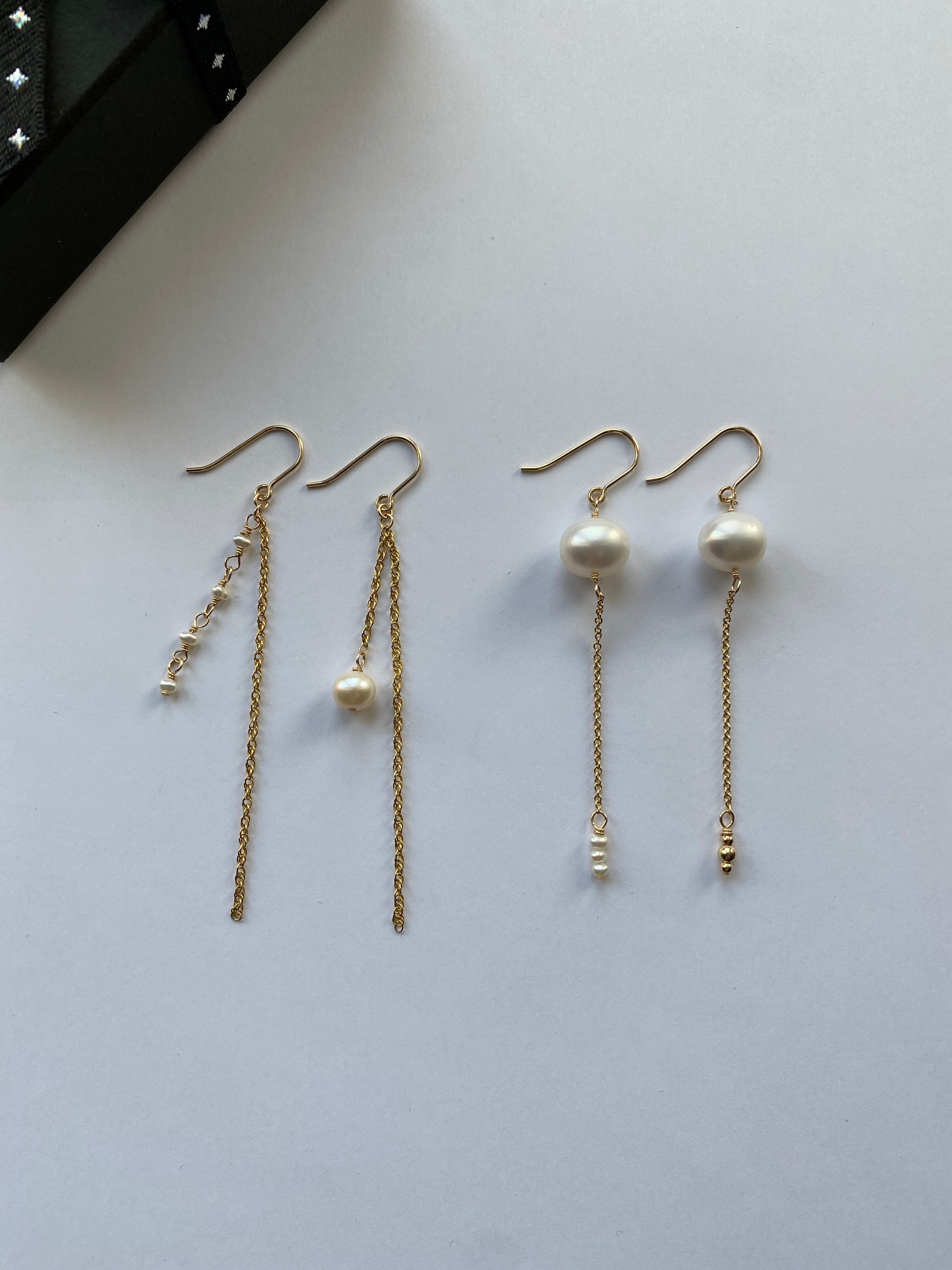 大ぶりの淡水パールに縦ラインのチェーンと丸玉ビーズを合わせた個性的なデザインピアスです!