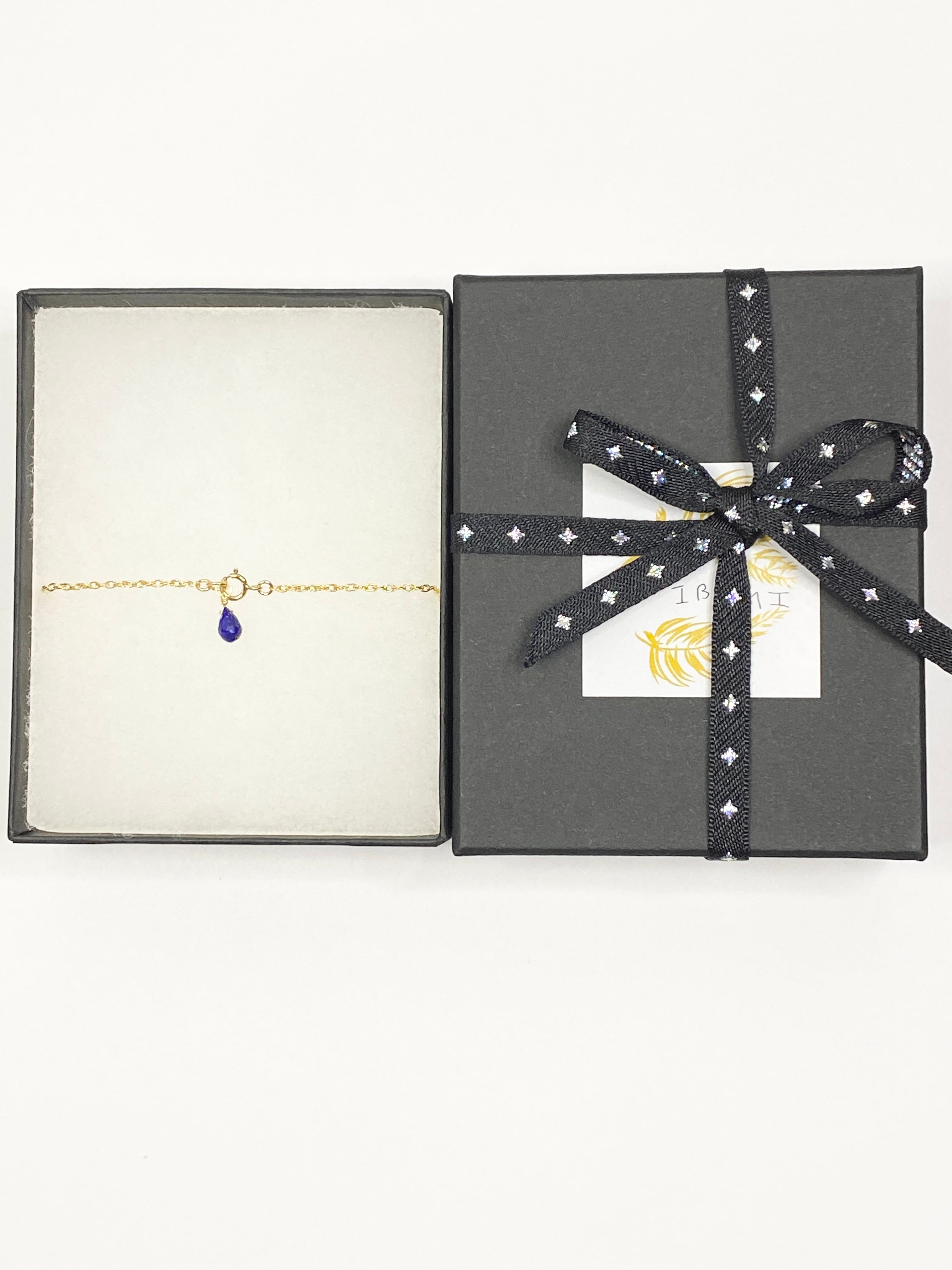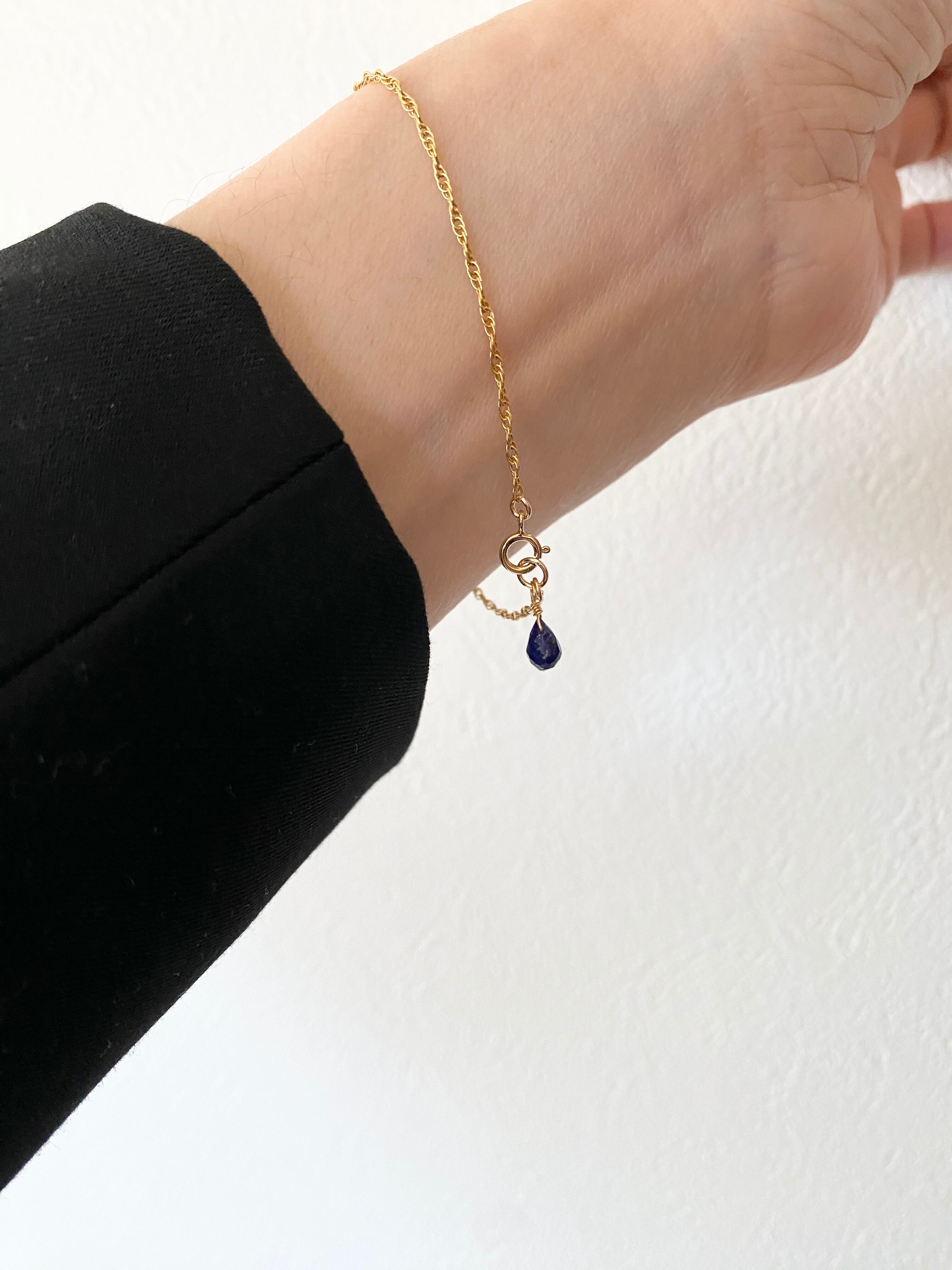 神々の住む夜空を連想させる濃い青色のラピスラズリを使用した美しいブレスレットです。持ち主を邪悪なものから守ると信じられ、心の平穏をもたらす力を秘めたこの天然石は、旅のお供にぴったりです。ワンポイントの天然石が手首で優雅に揺れ、シンプルでありながら存在感を放ちます。
