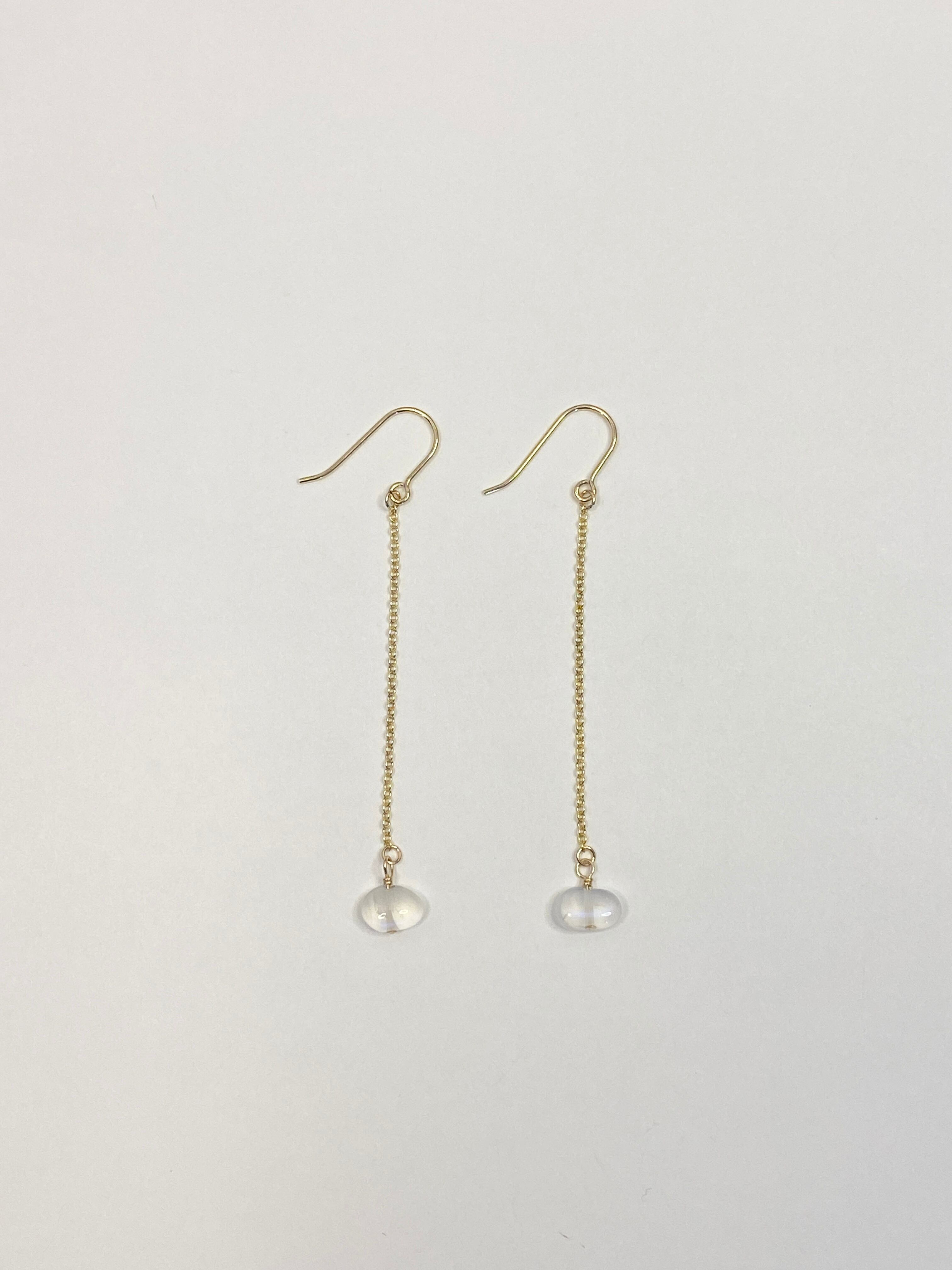 月の光のような神秘的な輝きを持つムーンストーンを使用した、シンプルながら存在感のあるピアスです。繊細なチェーンが耳元で優雅に揺れ、どんなスタイルにもマッチします。