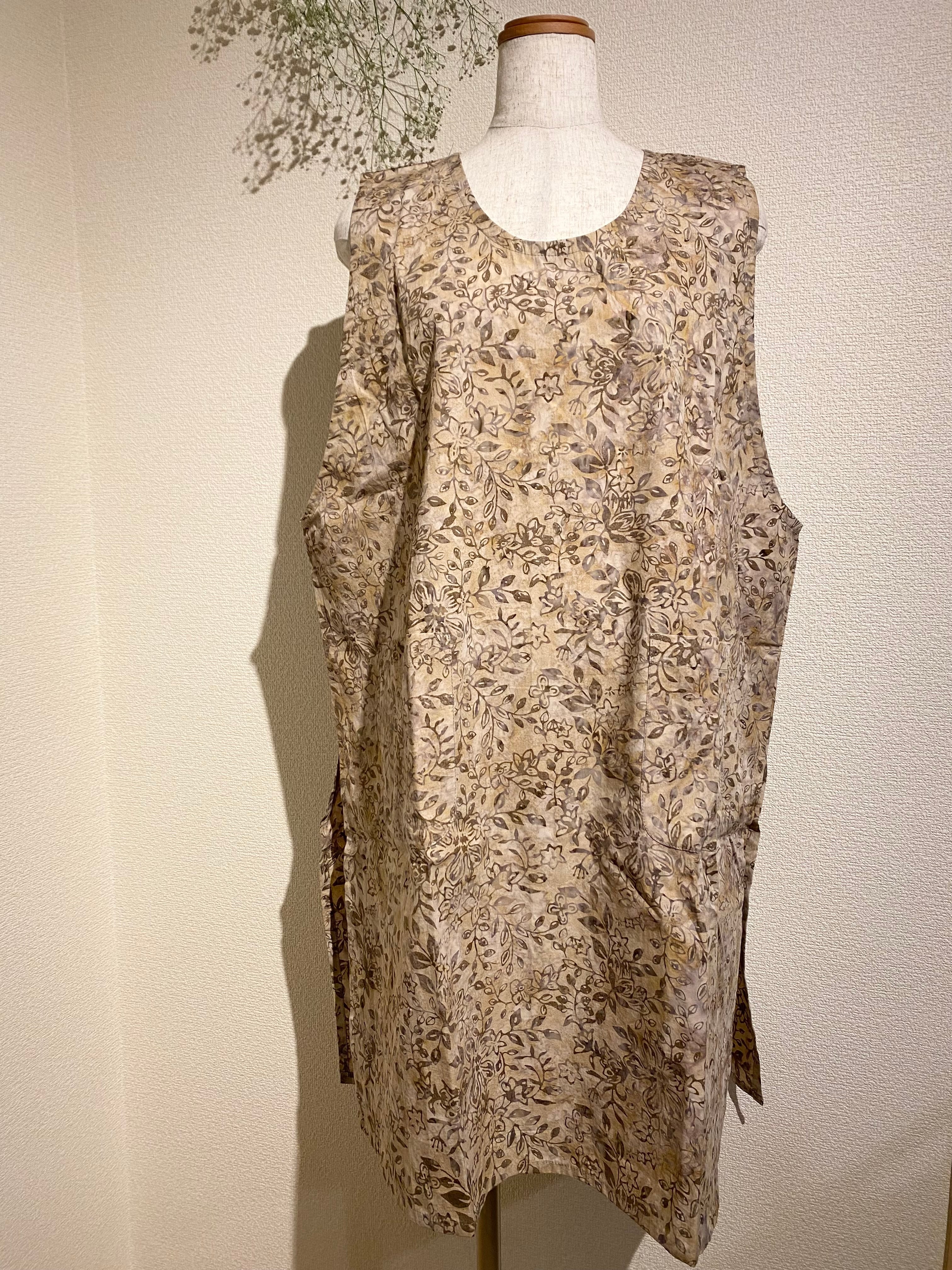 美しい色合いと独特の柄が特徴のこのエプロンドレスは、被って着ることができる便利さを提供します。首周りと袖ぐりが大きめサイズで、リラックスした着心地を実現。日常の家事やお出かけ着としても活躍します。