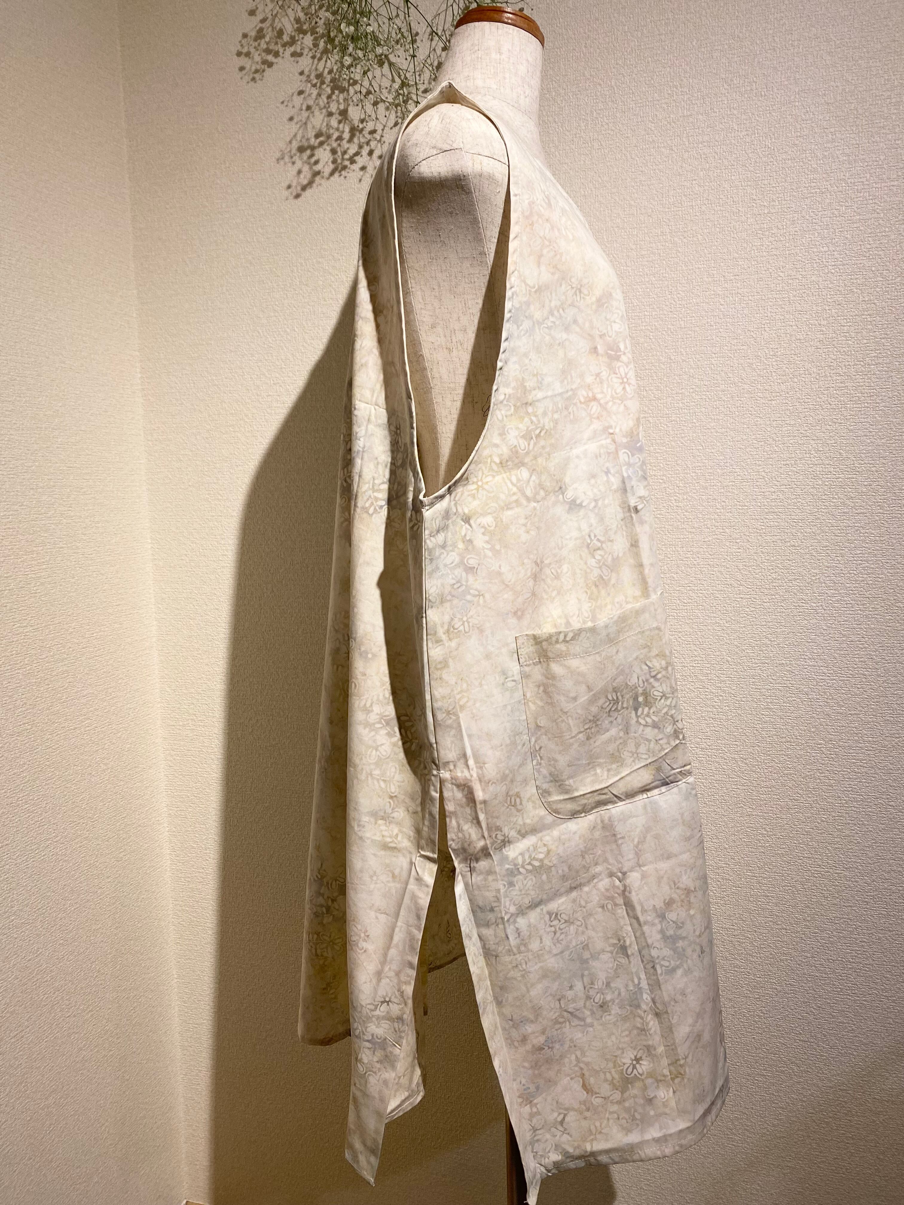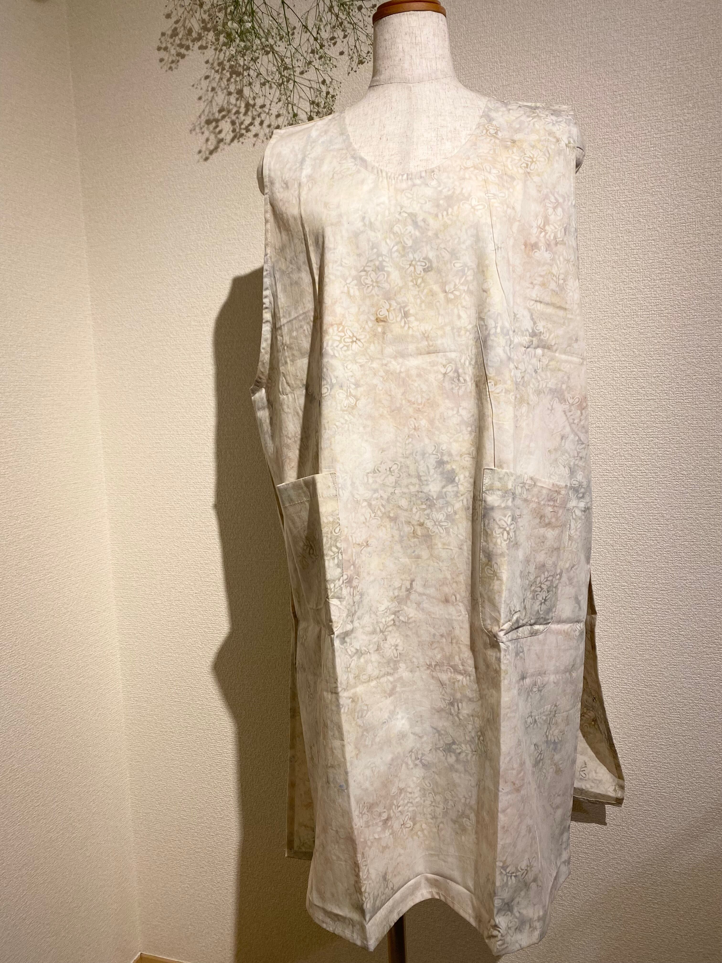 美しい色合いと独特の柄が特徴のこのエプロンドレスは、被って着ることができる便利さを提供します。首周りと袖ぐりが大きめサイズで、リラックスした着心地を実現。日常の家事やお出かけ着としても活躍します。