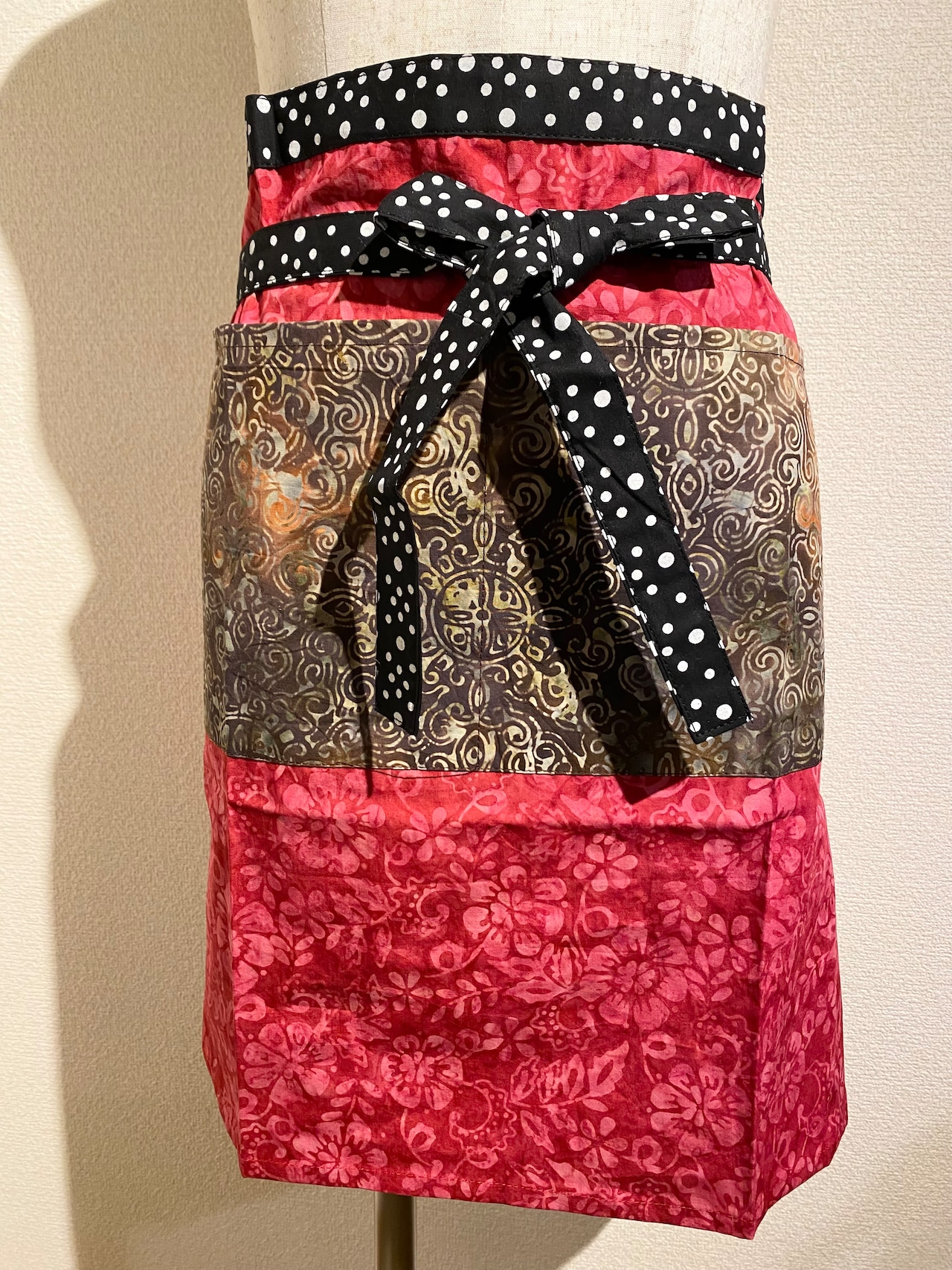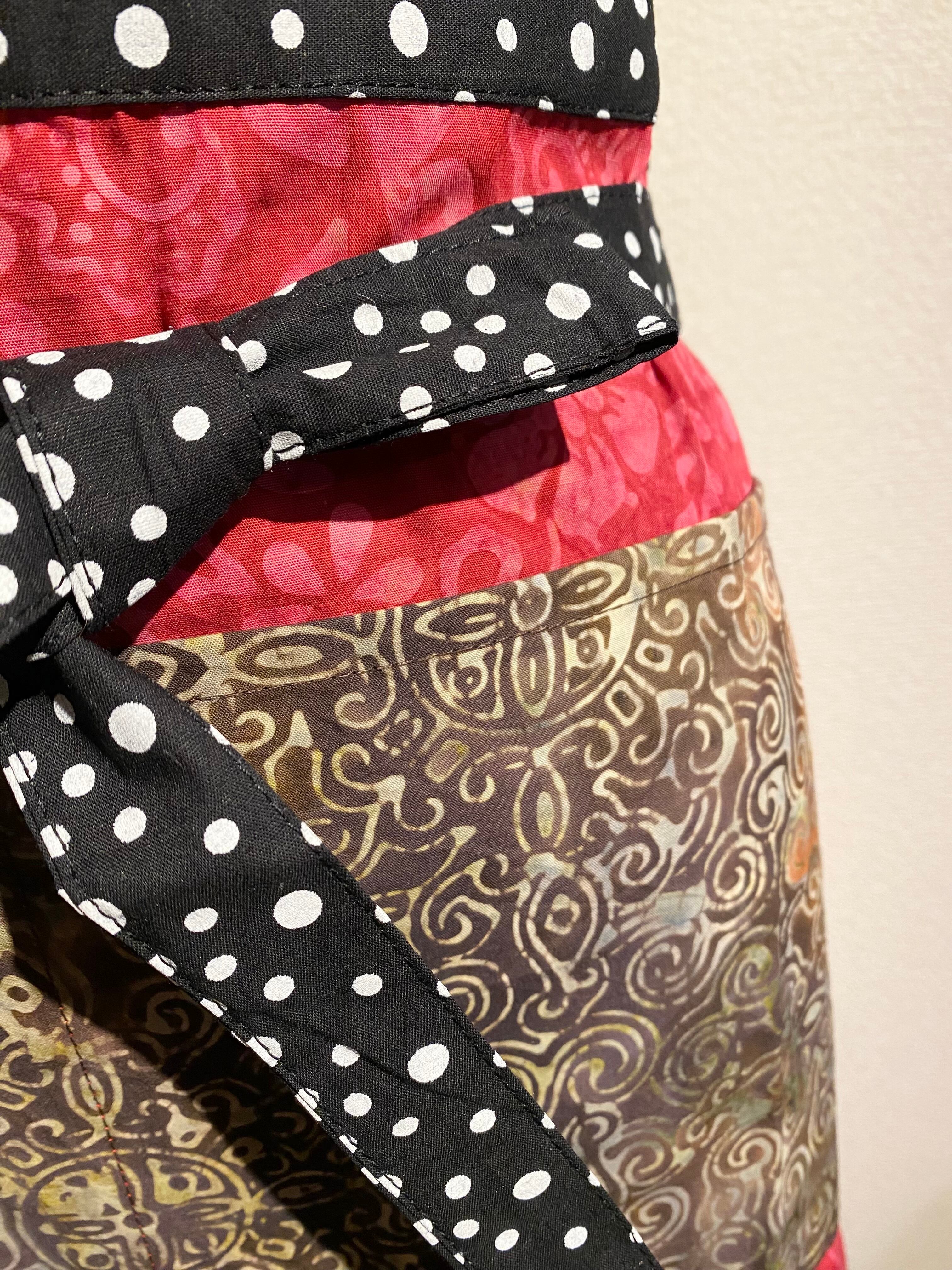 3種類のバティックがパッチワークのように柄合わせされており、他にはない面白さが魅力のこのカフェエプロンは、毎日の料理やカフェタイムをより特別なものにしてくれます。
