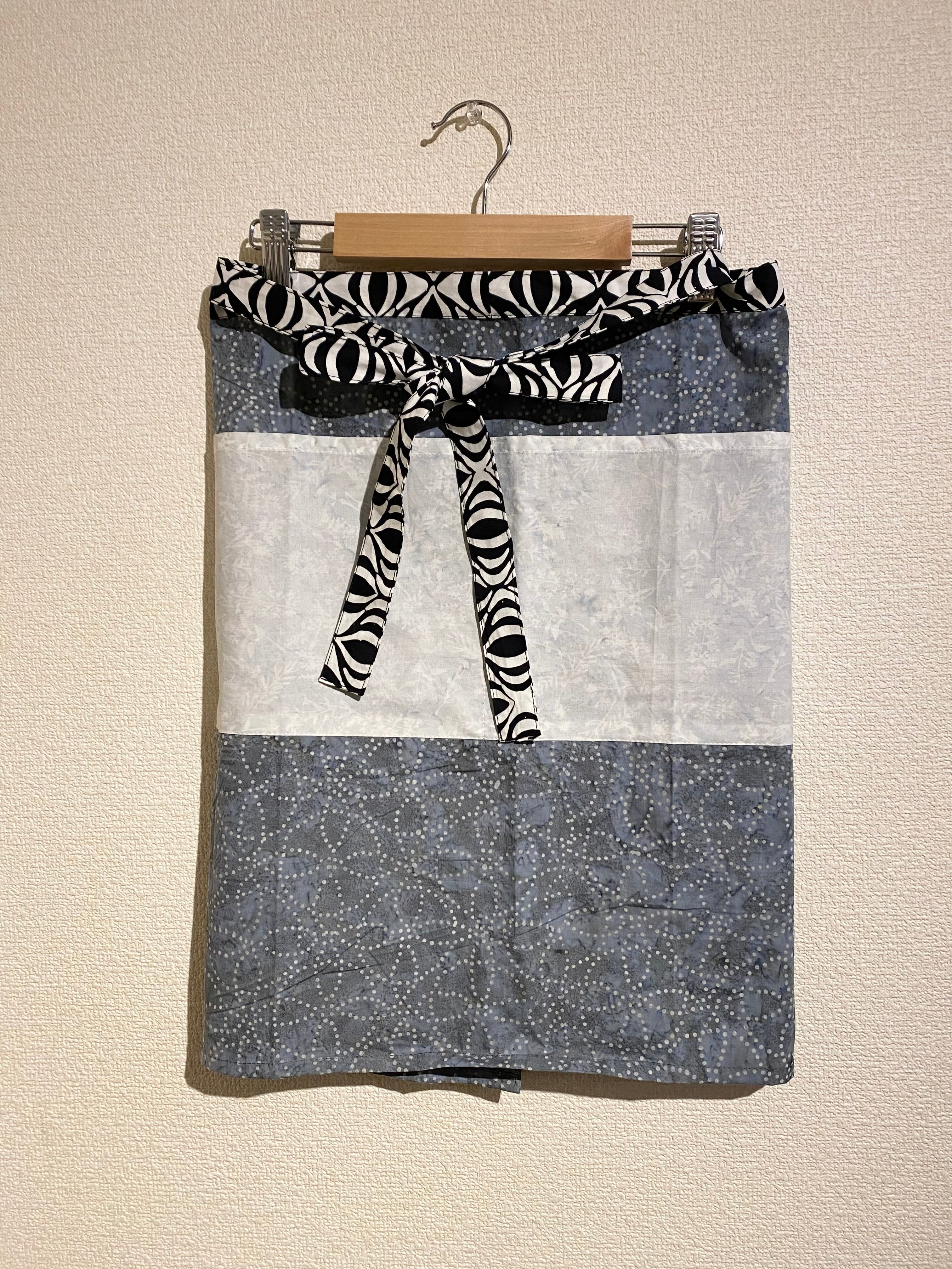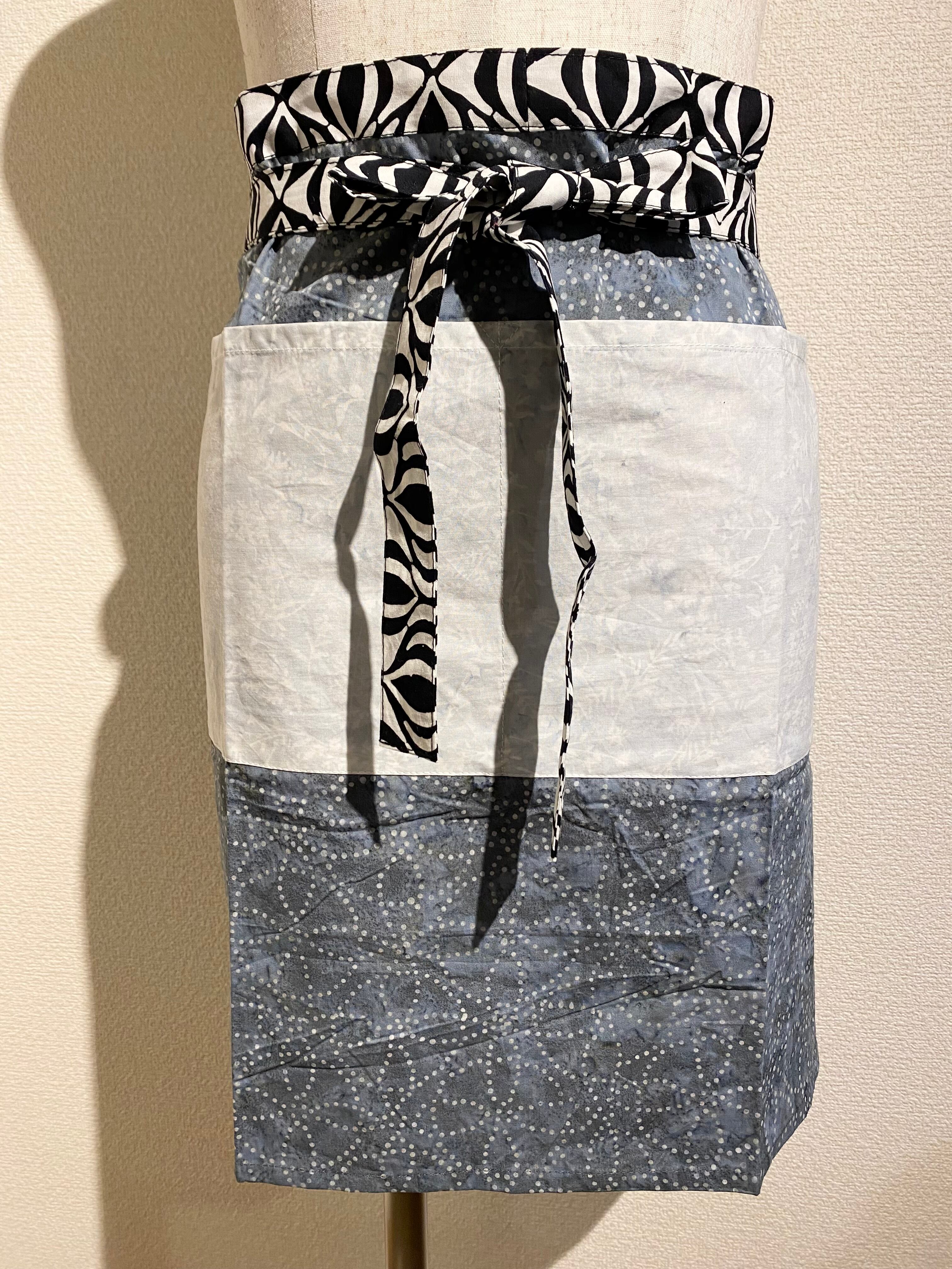 3種類のバティックがパッチワークのように柄合わせされており、他にはない面白さが魅力のこのカフェエプロンは、毎日の料理やカフェタイムをより特別なものにしてくれます。