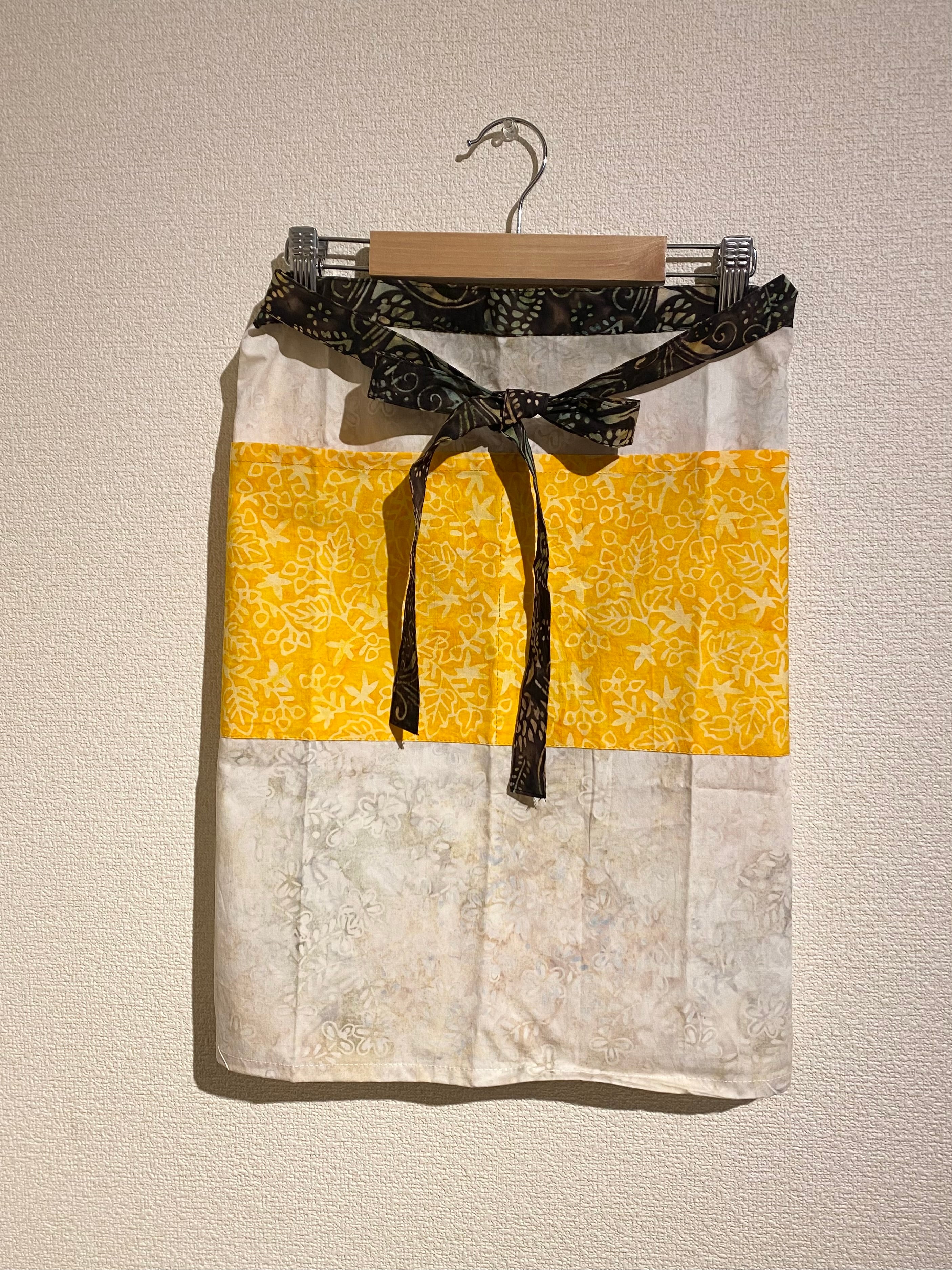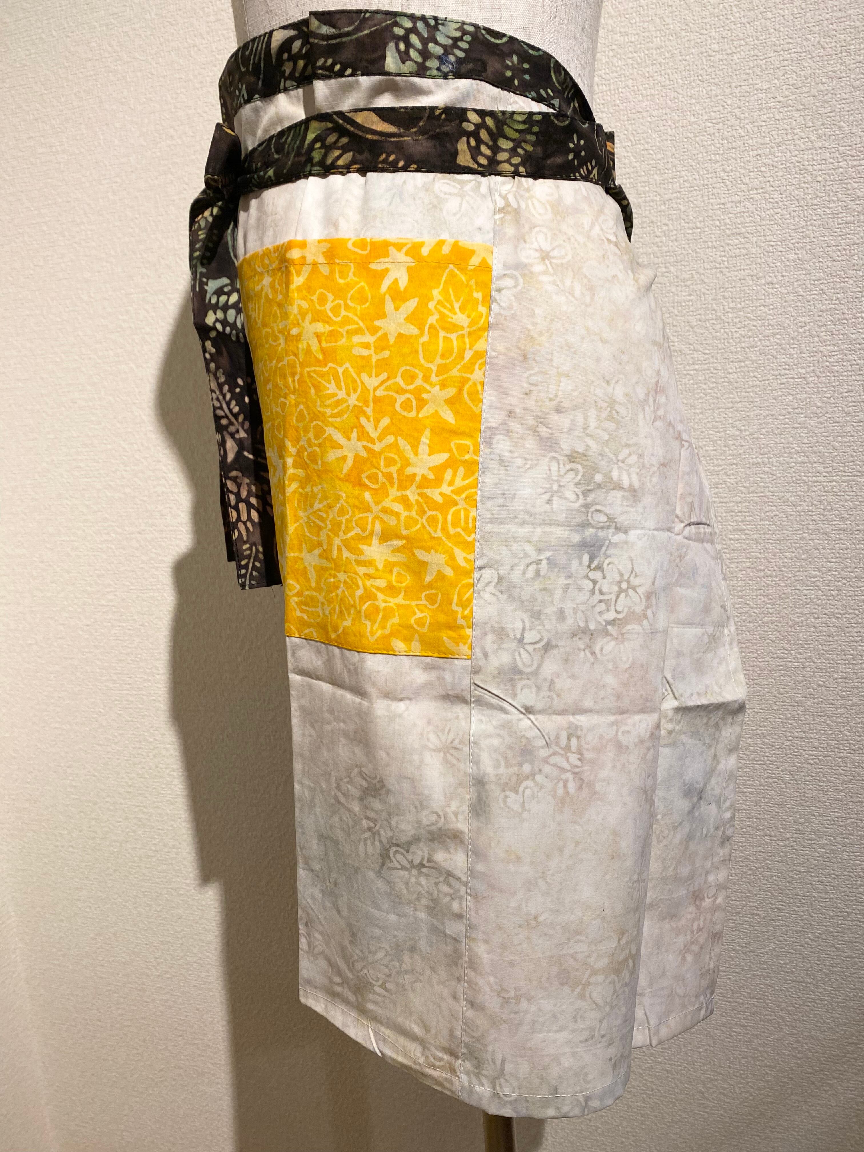 3種類のバティックがパッチワークのように柄合わせされており、他にはない面白さが魅力のこのカフェエプロンは、毎日の料理やカフェタイムをより特別なものにしてくれます。