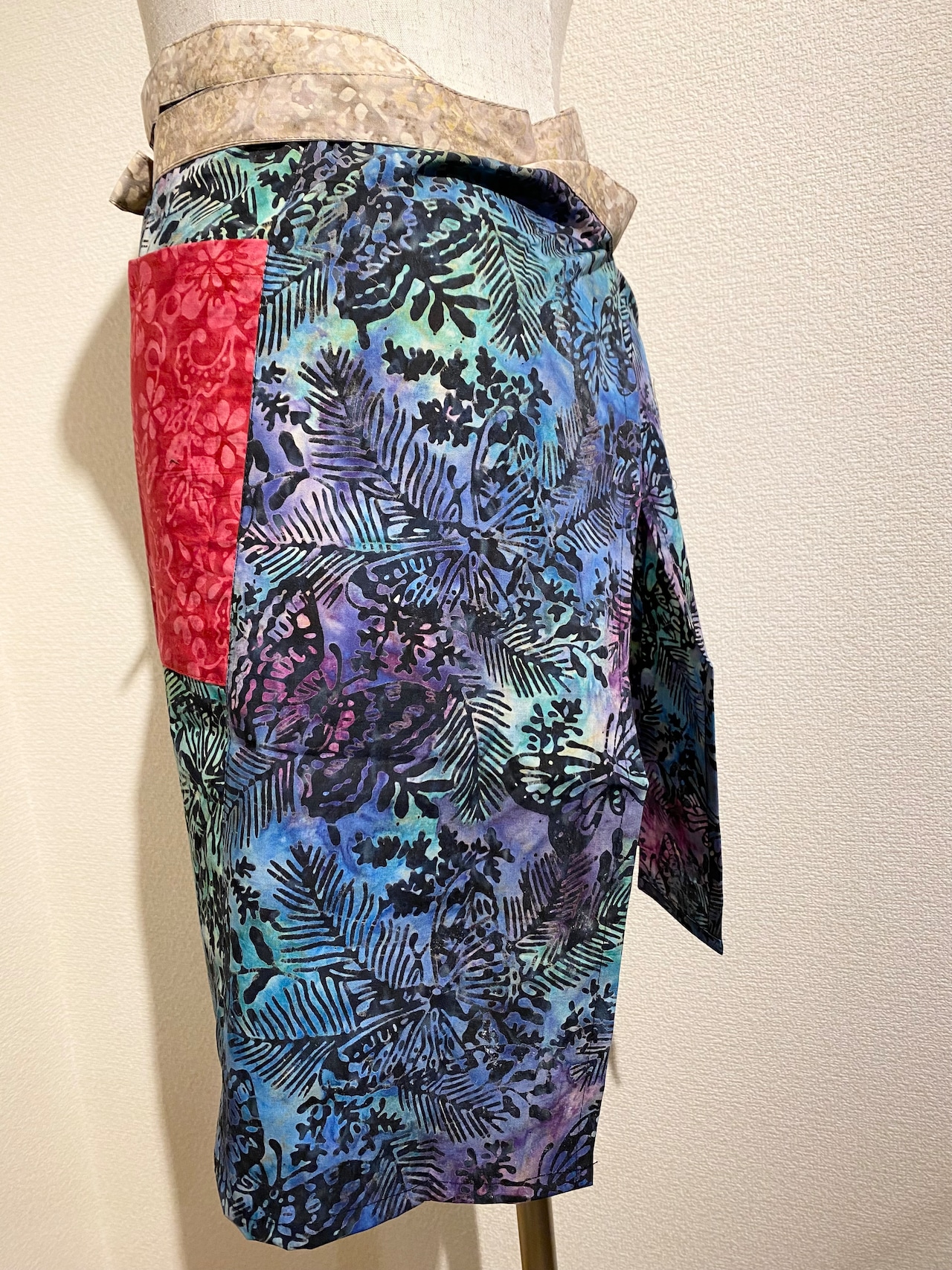 3種類のバティックがパッチワークのように柄合わせされており、他にはない面白さが魅力のこのカフェエプロンは、毎日の料理やカフェタイムをより特別なものにしてくれます。
