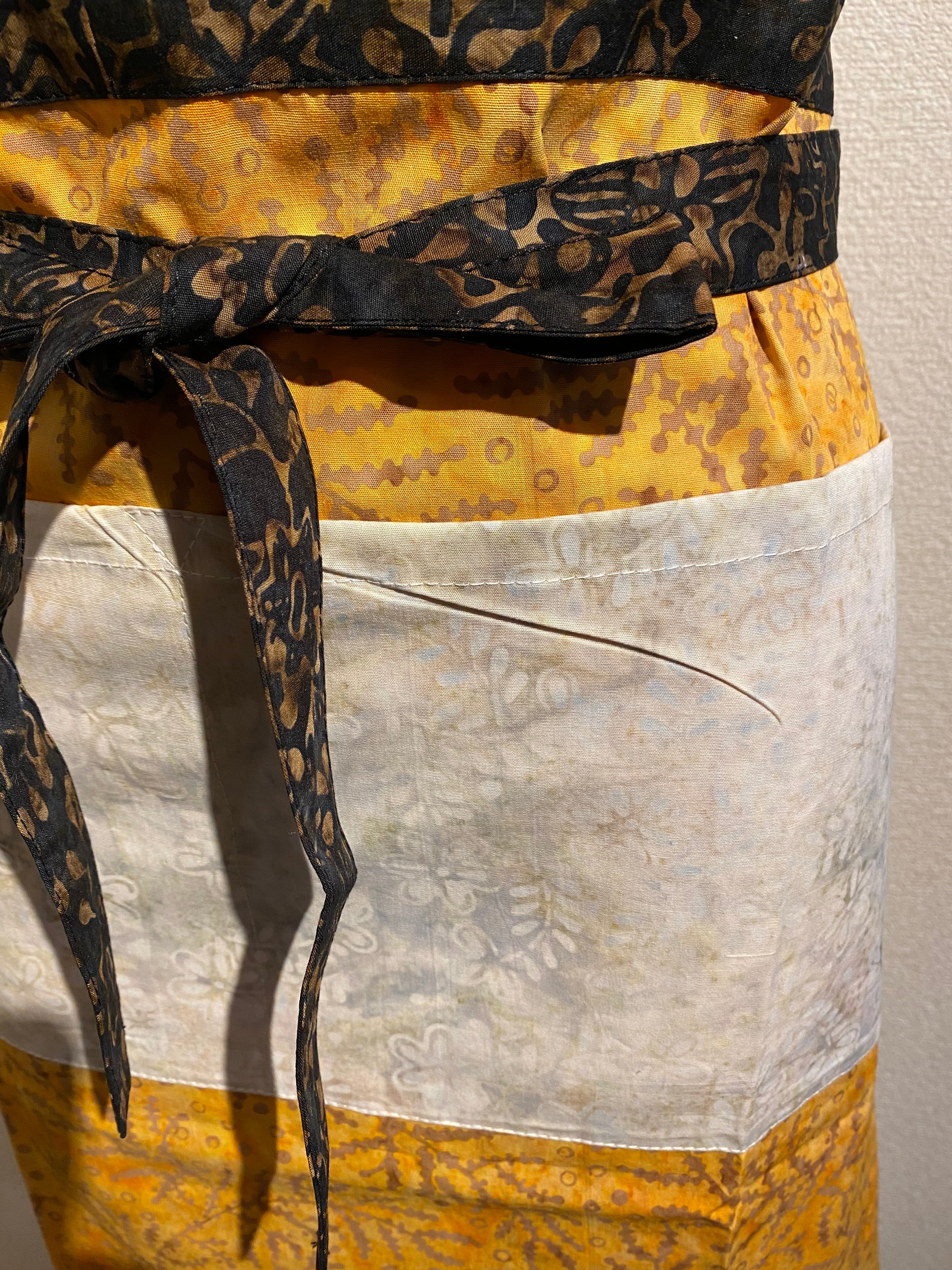 3種類のバティックがパッチワークのように柄合わせされており、他にはない面白さが魅力のこのカフェエプロンは、毎日の料理やカフェタイムをより特別なものにしてくれます。