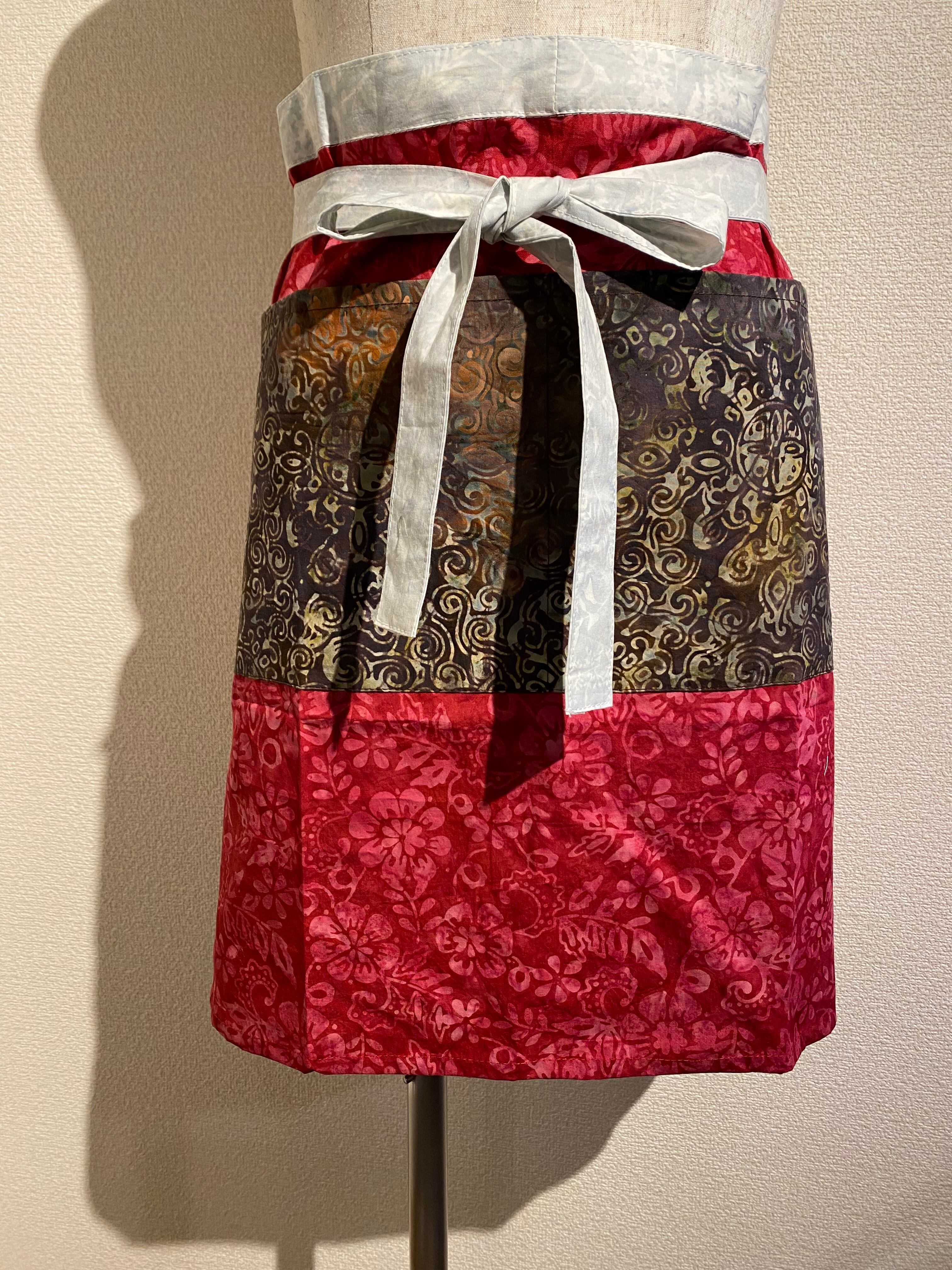 3種類のバティックがパッチワークのように柄合わせされており、他にはない面白さが魅力のこのカフェエプロンは、毎日の料理やカフェタイムをより特別なものにしてくれます。